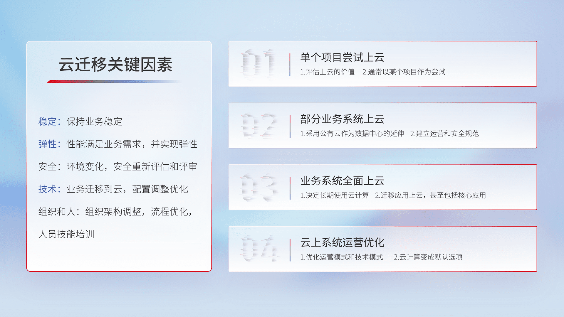 结合实际业务,,,从规划设计、、云平台选型、、、、云原生改造、、、数据迁移、、、、集成交付,,,迁移全过程为客户识别最佳上云路径,,,,做好风险识别管理,,,,设计网络架构、、身份权限、、、安全审计合规、、操作审计、、日志审计、、监控告警策略、、多站点容灾设计等,,,,对云上基础设施进行整体规划,,,提升IT治理水平,,,,以满足弹性、、高可用、、、高性能的需求。。