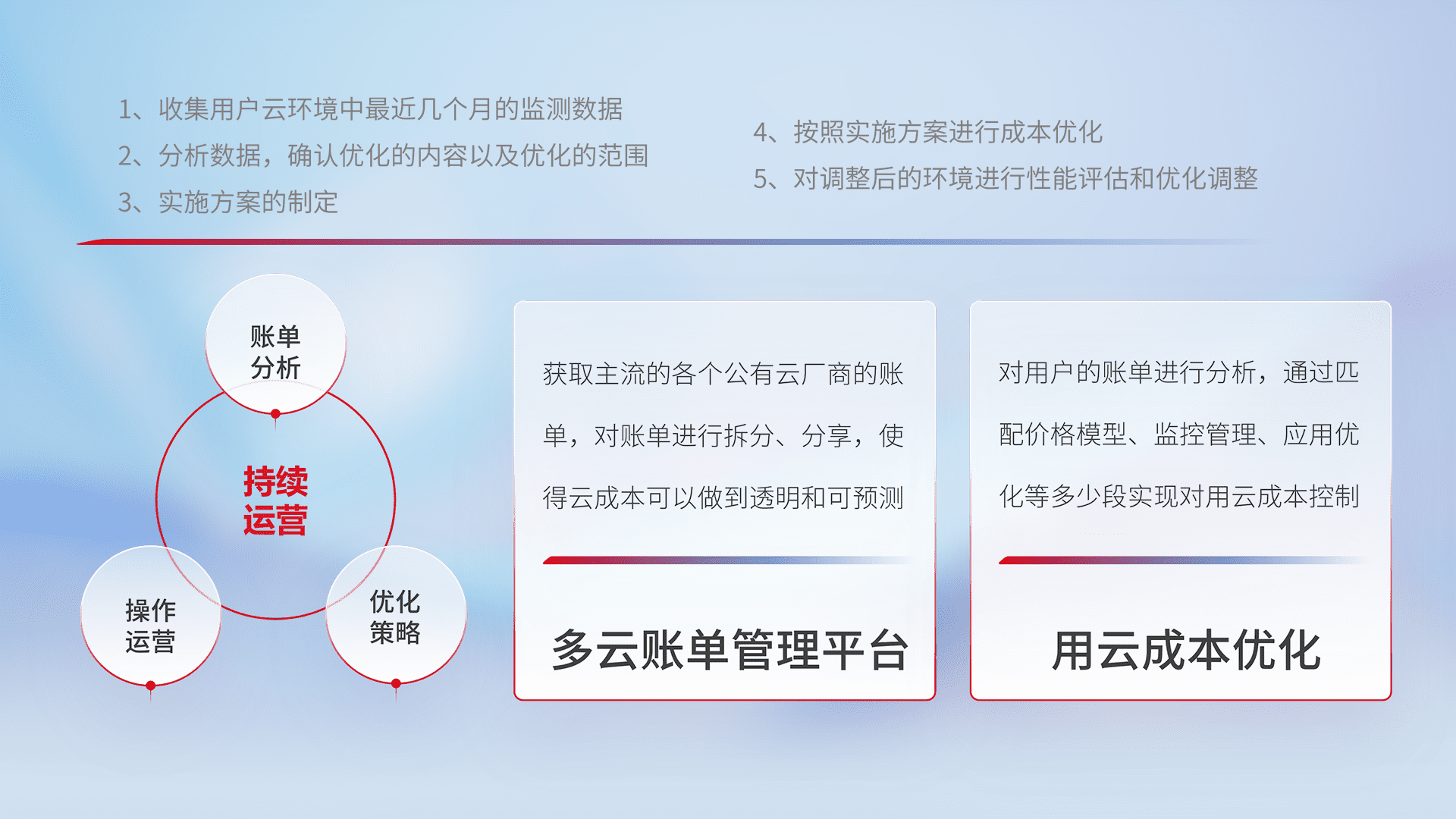 通过多云纳管,,,,以统一的资源数据模型把客户的云资源进行抽象和封装,,,进而实现对多云资源的统一操作,,保障云资源管理的可靠性、、、稳定性与可用性。。量身定制化运维内容,,配置、、、开发运维、、、、补丁管理、、备份、、、监控、、认证和访问管理、、审计和日常巡检等,,保障在用云过程中的可靠度,,,,稳定度以及高可用率。。。